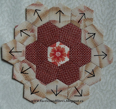 This hexagon rosette is a directional print and I made sure that the white chrysanthemums were radiating out from the centre.
